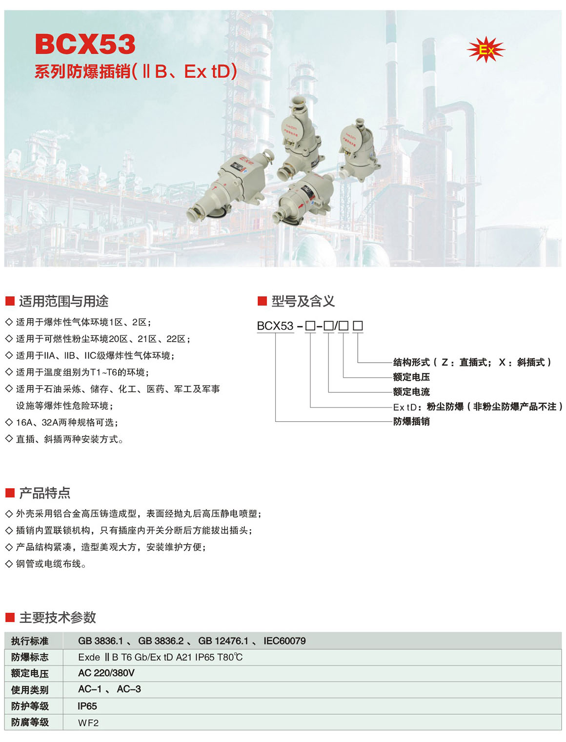 當前位置: 首頁 > 產(chǎn)品中心 > 防爆電器系列 > BCX53系列防爆插銷(ⅡB、Ex tD)