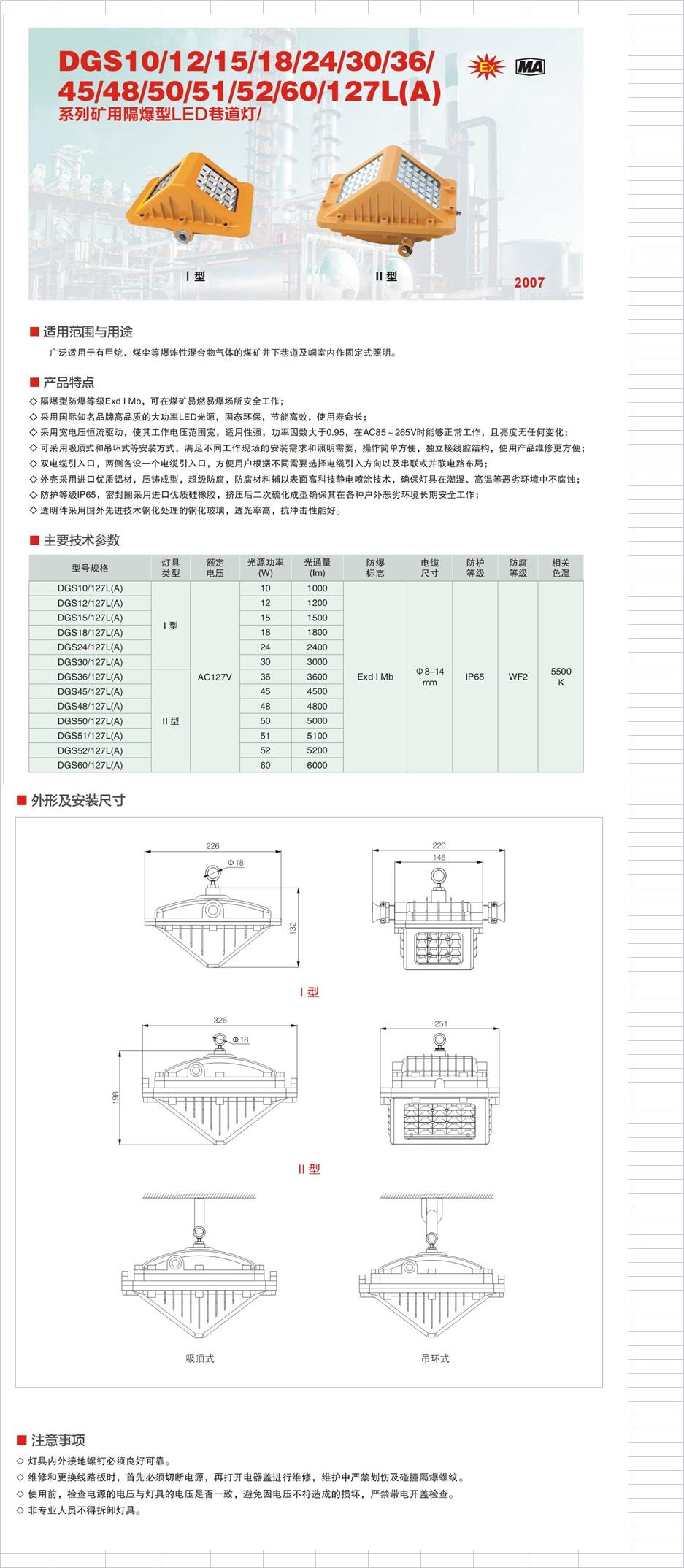 煤礦井下防爆燈 DGS10/12/15/18/24/30\36/45/48/50/51/52/60/127L(A)礦用防爆燈 LED防爆燈 防爆工礦燈 防爆泛光燈 防爆投光燈 DGS50/127L(A)礦用隔爆型LED巷道燈 適用場所:適用于廠礦企業(yè)、儲存、紡織、石油、化工電力等設(shè)施等易燃易爆場所作投光或泛光照明。